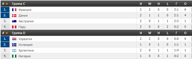 C.-ПЕТЕРБУРГ, 22 июн – РИА Новости, Тарас Барабаш. Очередной игровой день на чемпионате мира по футболу 2018 года ознаменовался второй победой сборной Франции над командой Перу (1:0), ничейным исходом в матче команд Дании и Австралии (1:1) и поражением аргентинцев от хорватов (0:3).