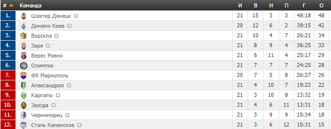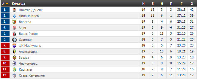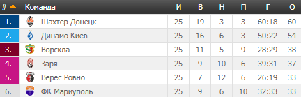| 1 | ШАХТЕР | 14 | 10 | 3 | 1 | 27-11 | 33 |