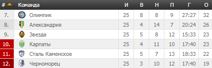 | 11 | ЧЕРНОМОРЕЦ | 14 | 2 | 5 | 7 | 8-21 | 11 |