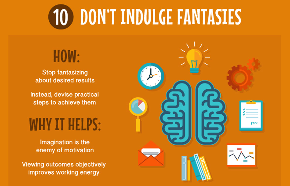 - Визуализируйте себя в будущем. Например, вы можете визуализировать, что вы можете расслабиться после завершения, визуализировать, что вас вознаграждают за прогресс, или визуализировать, что вам приходится решать проблемы, связанные с пропуском важного срока.