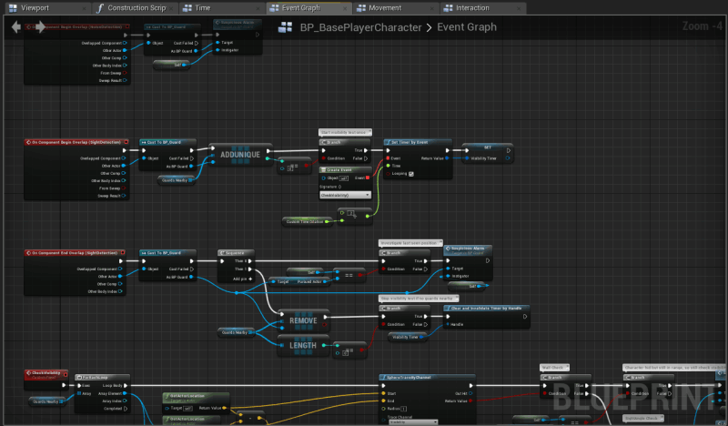 EventGraph Blueprint содержит граф узлов, который использует события и вызовы функций для выполнения действий в ответ на игровые события, связанные с Blueprint. Это используется для добавления функциональности, общей для всех экземпляров Blueprint. Здесь настраиваются интерактивность и динамические ответы. Например, светокопия может отреагировать на повреждение, отключив свои LightComponent и изменение материала, используемого его сеткой. Это автоматически обеспечит такое поведение для всех экземпляров светового Blueprint.