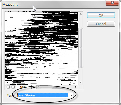 Теперь добавим текстуру к изображению. Горизонтальные линии придадут стиль постера изображению. Итак, создайте новый слой, кликнув по иконке Создать новый слой (Create a new layer) внизу панели слоев. Установите основной и фоновый цвет по умолчанию, нажав клавишу D. В меню выберите Фильтр > Рендеринг > Облака (Filter > Render > Clouds). К этой текстуре примените Фильтр > Оформление > Меццо-тинто (Filter > Pixelate > Mezzotint). В выпадающем меню фильтра выберите Длинные линии (Long Lines) и нажмите ОК.