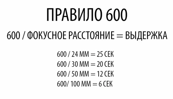 Максимальное время выдержки (в секундах) = 500 / Фокусное расстояние